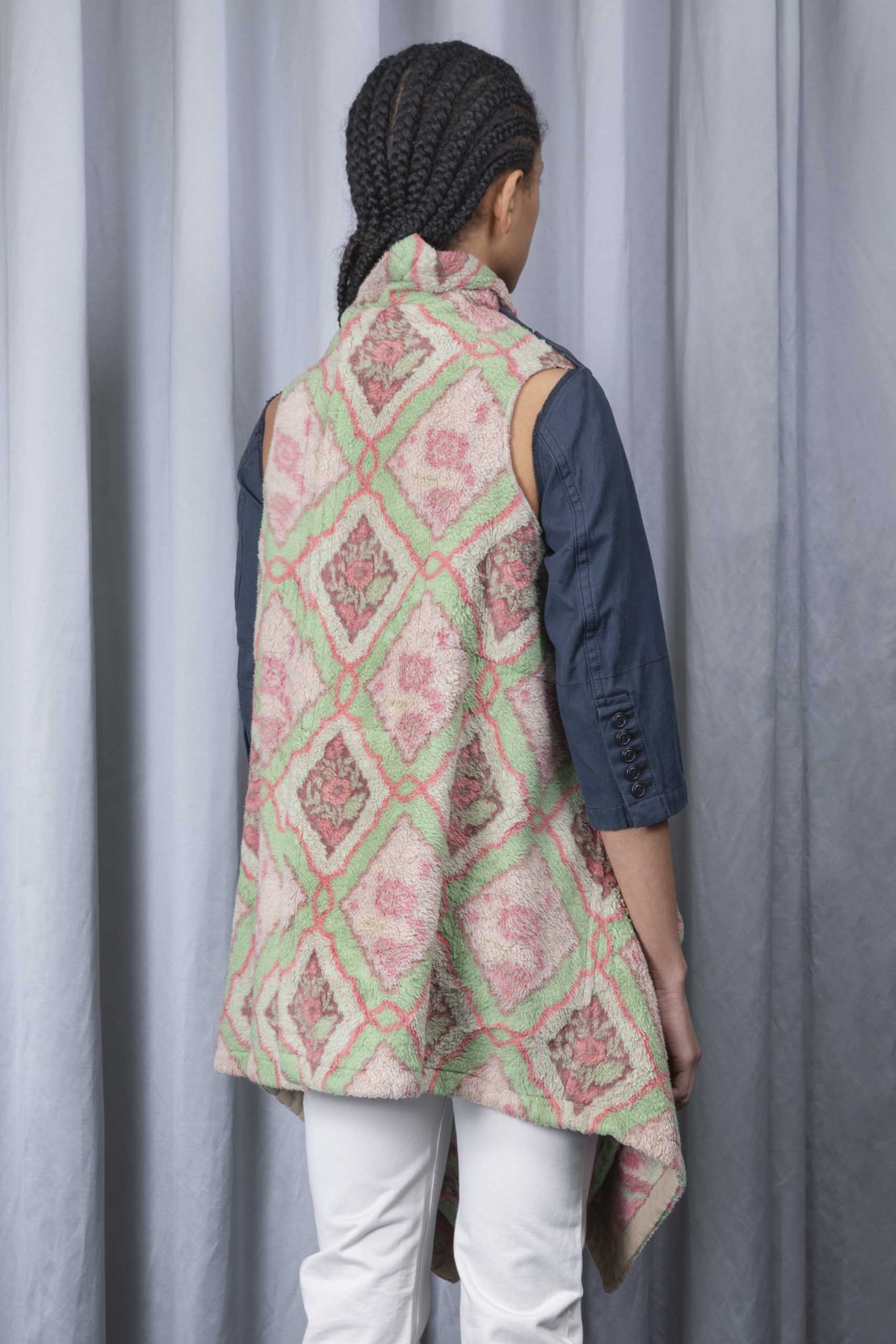 - under layer: pink, green and beige abstract print fleece (45% acrylic, 30% cotton, 25% polyester)