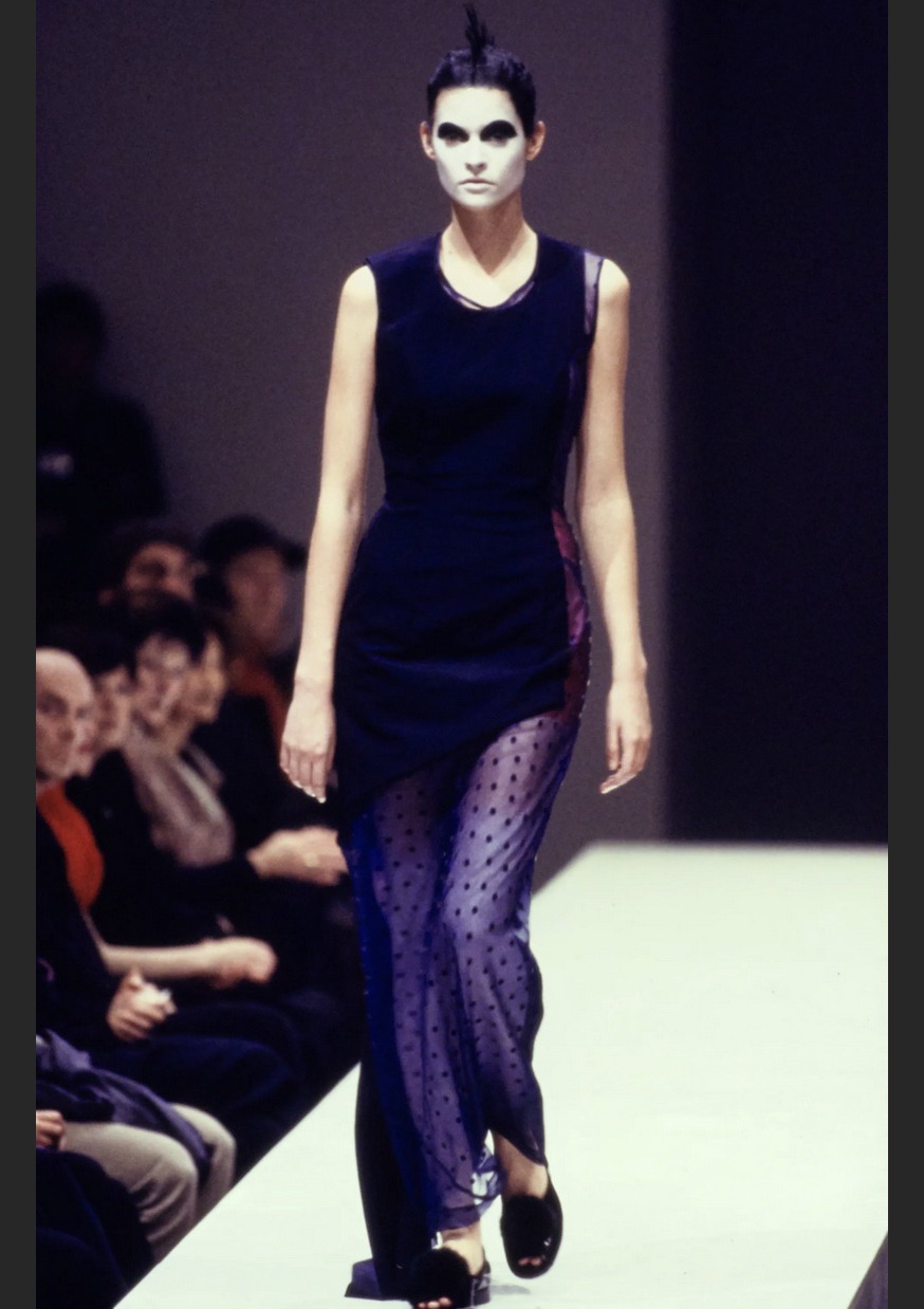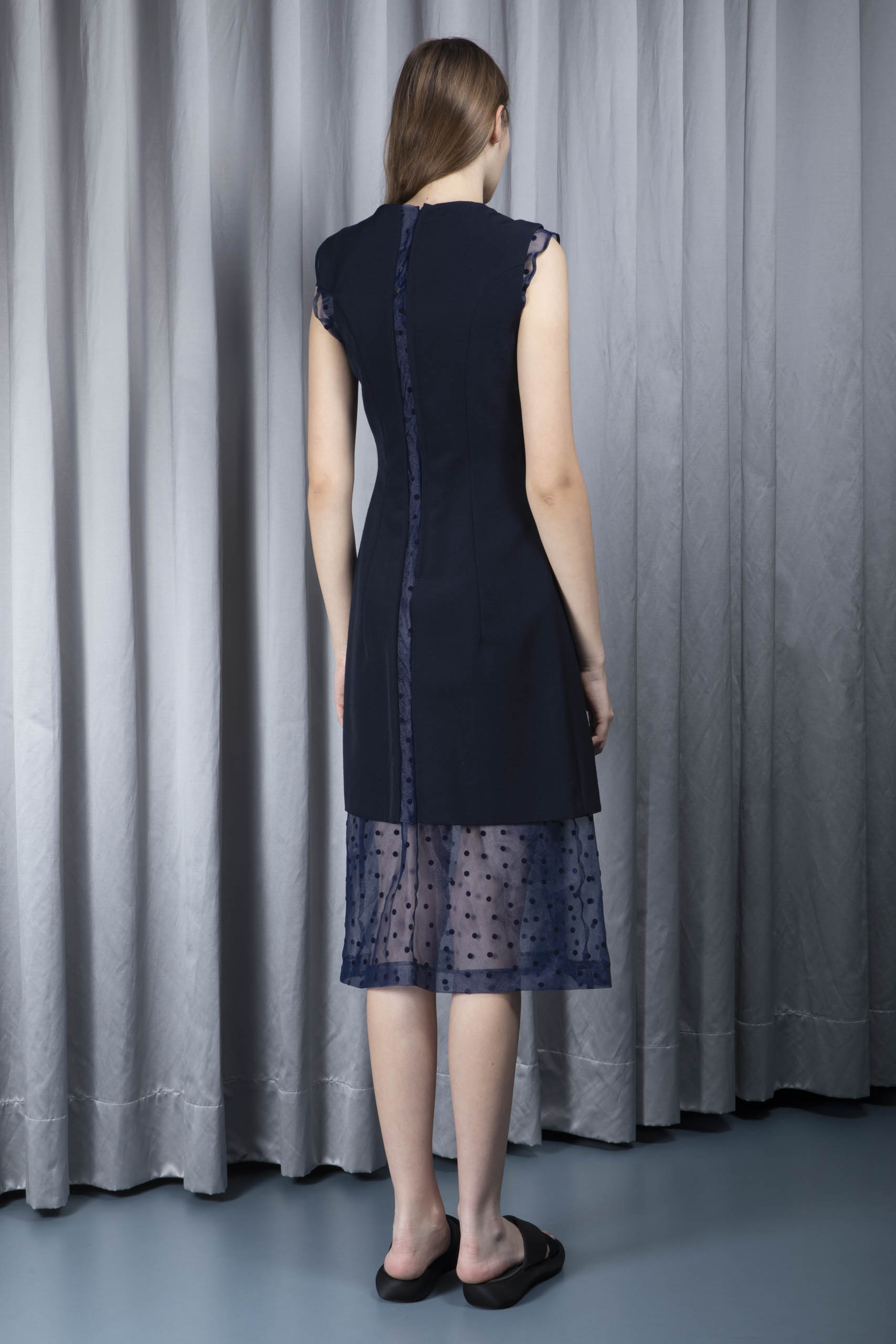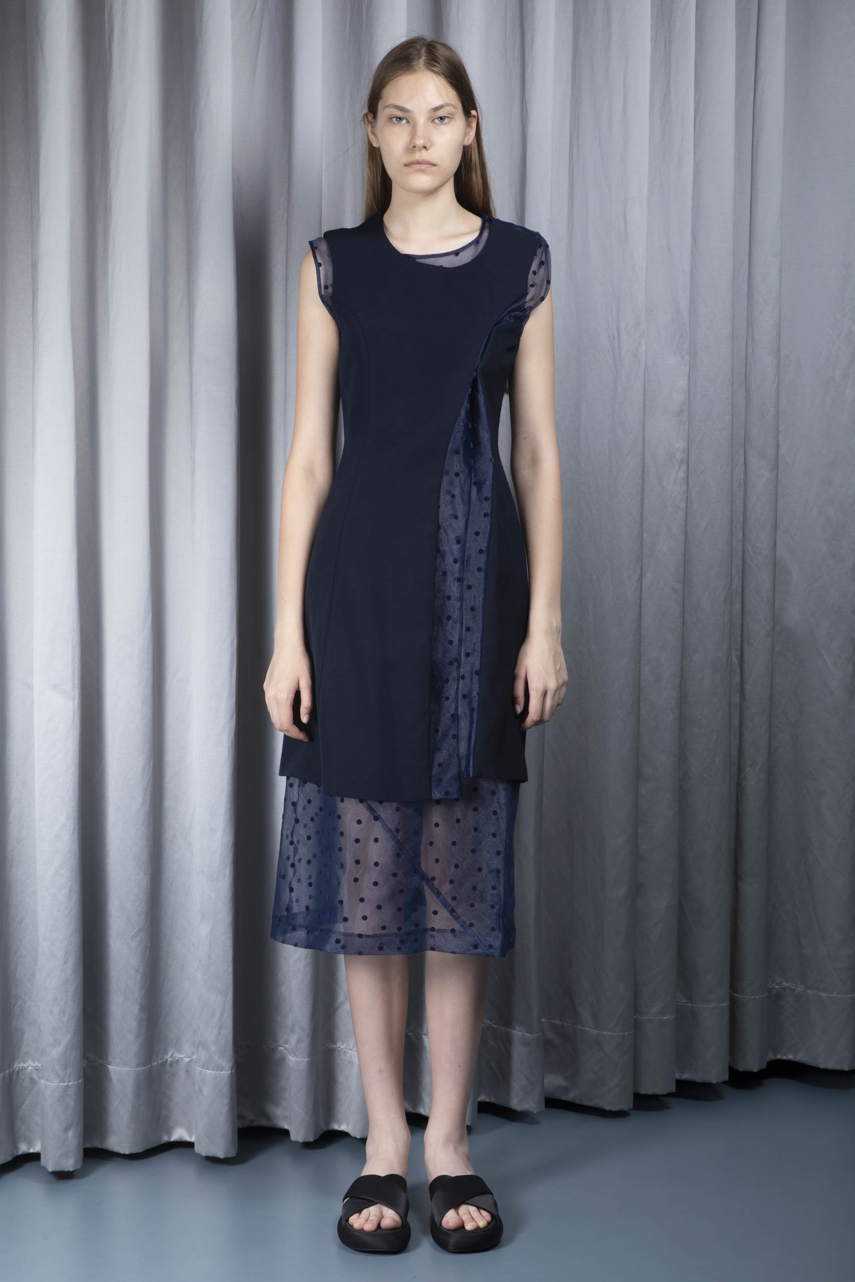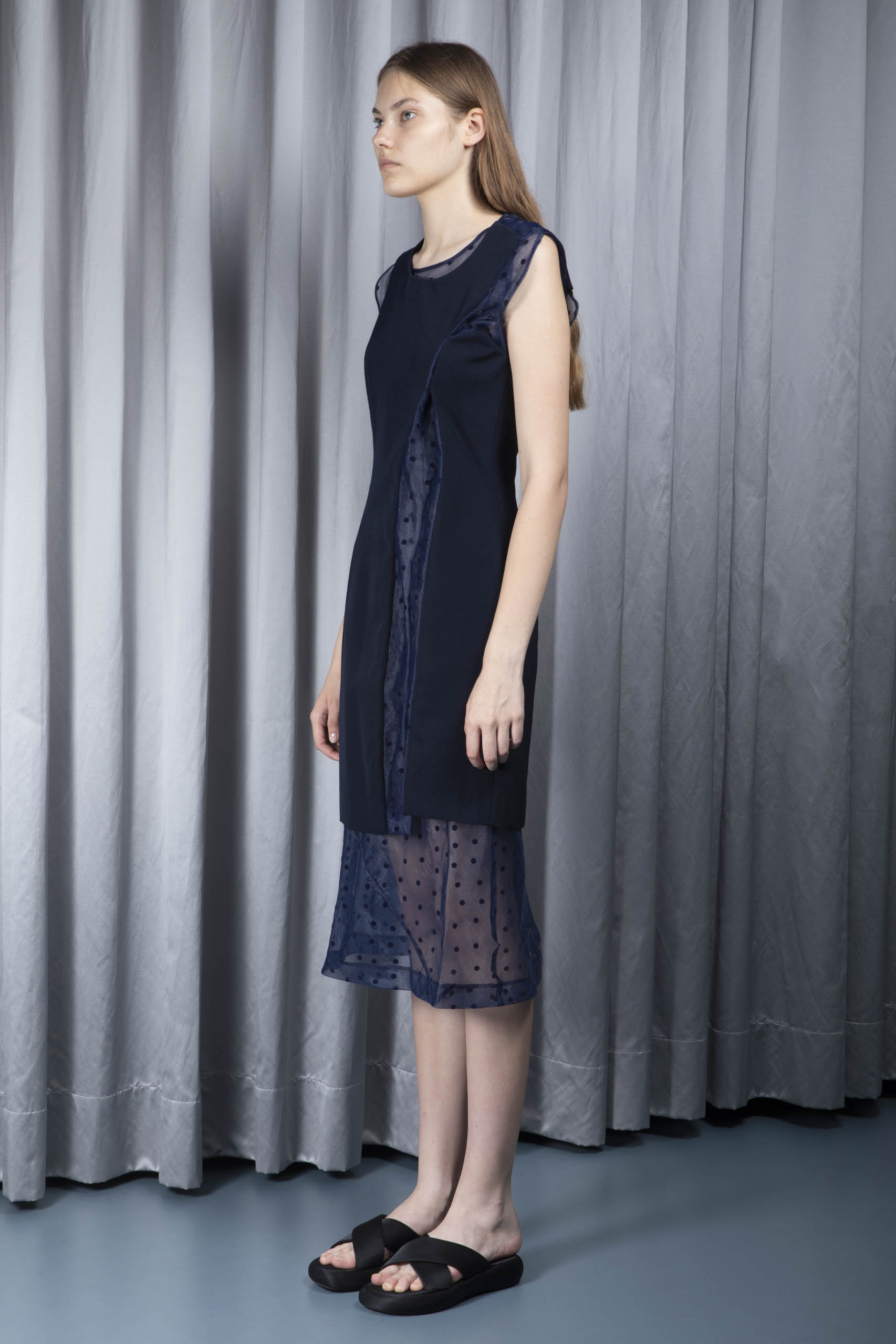 - main layer: twill cloth with vertical insert in sheer organza with velvet polka dot pattern, knee length