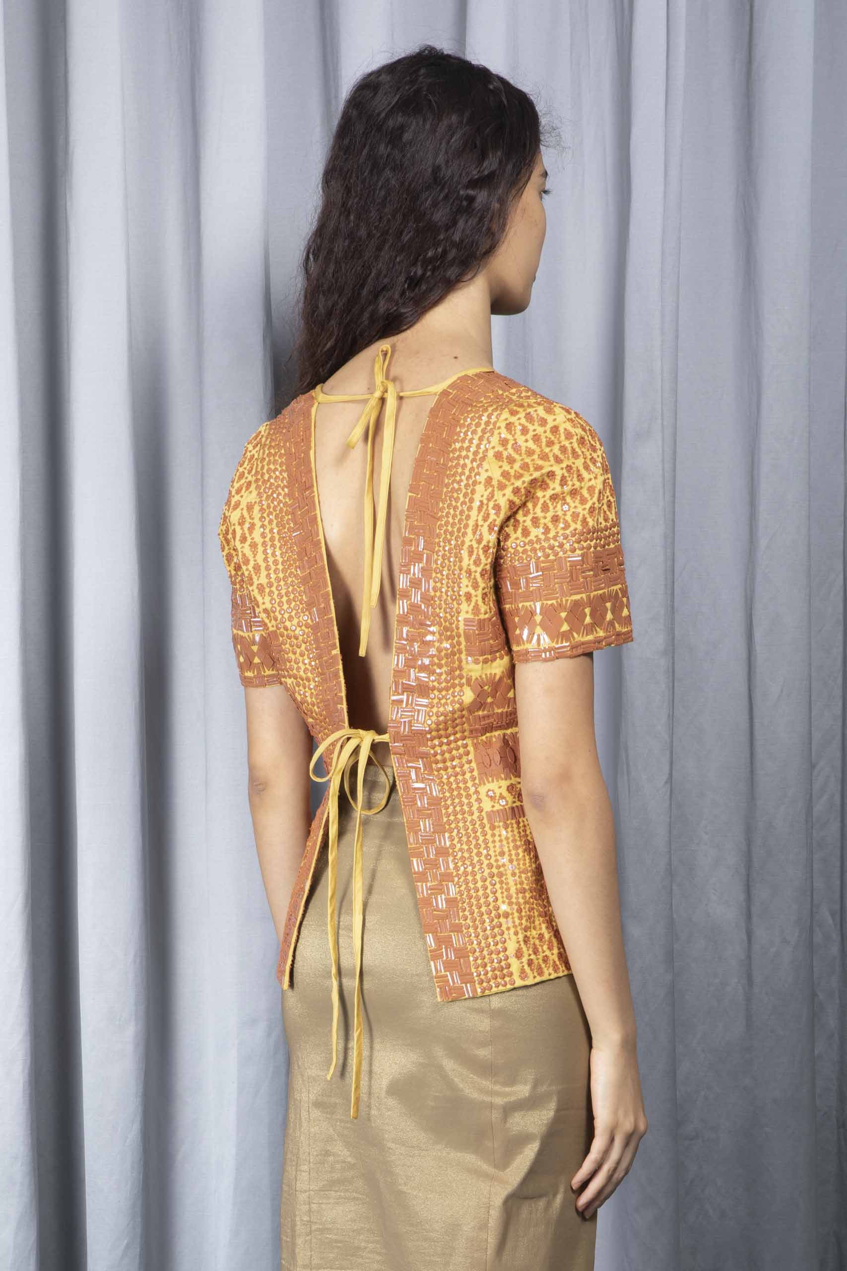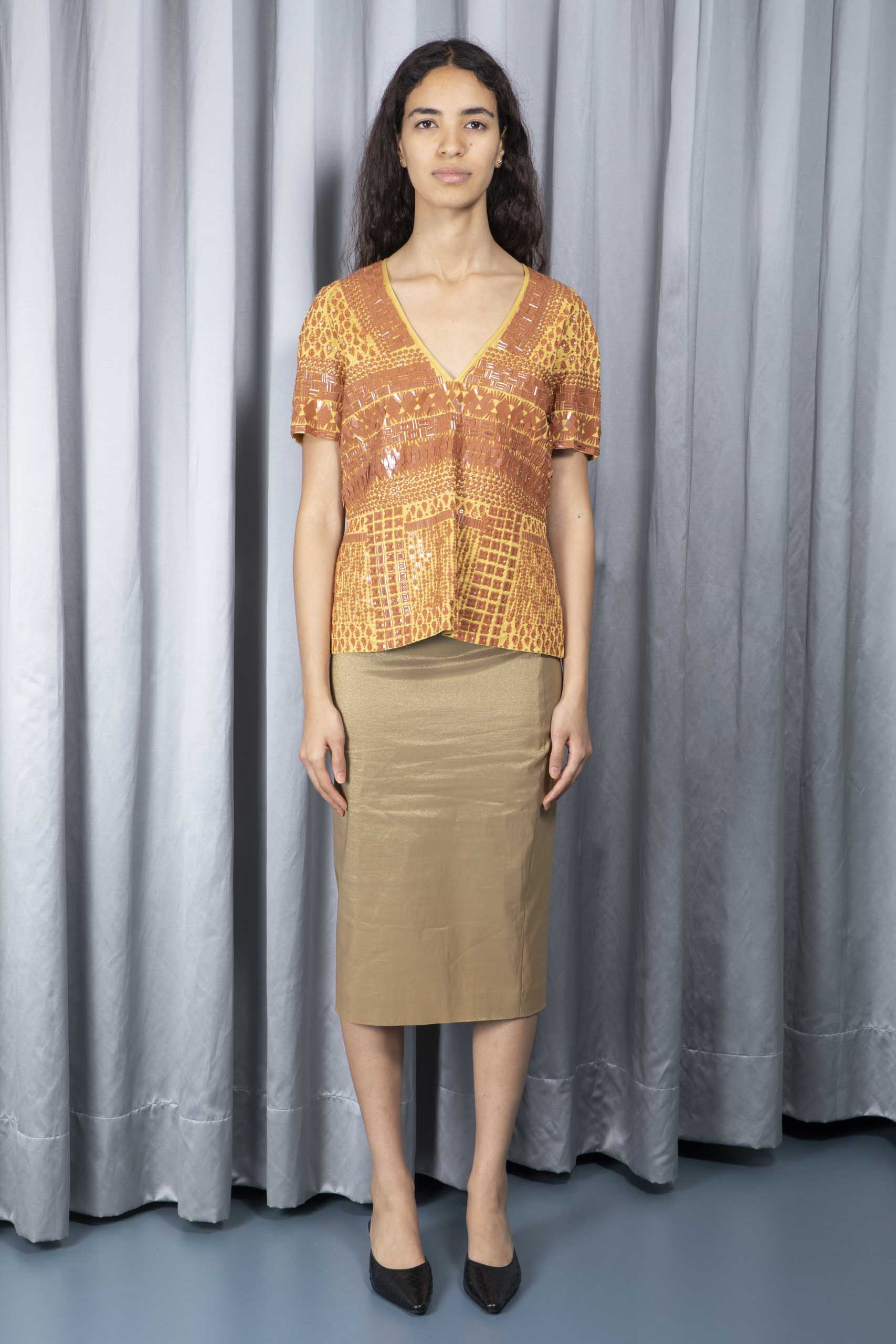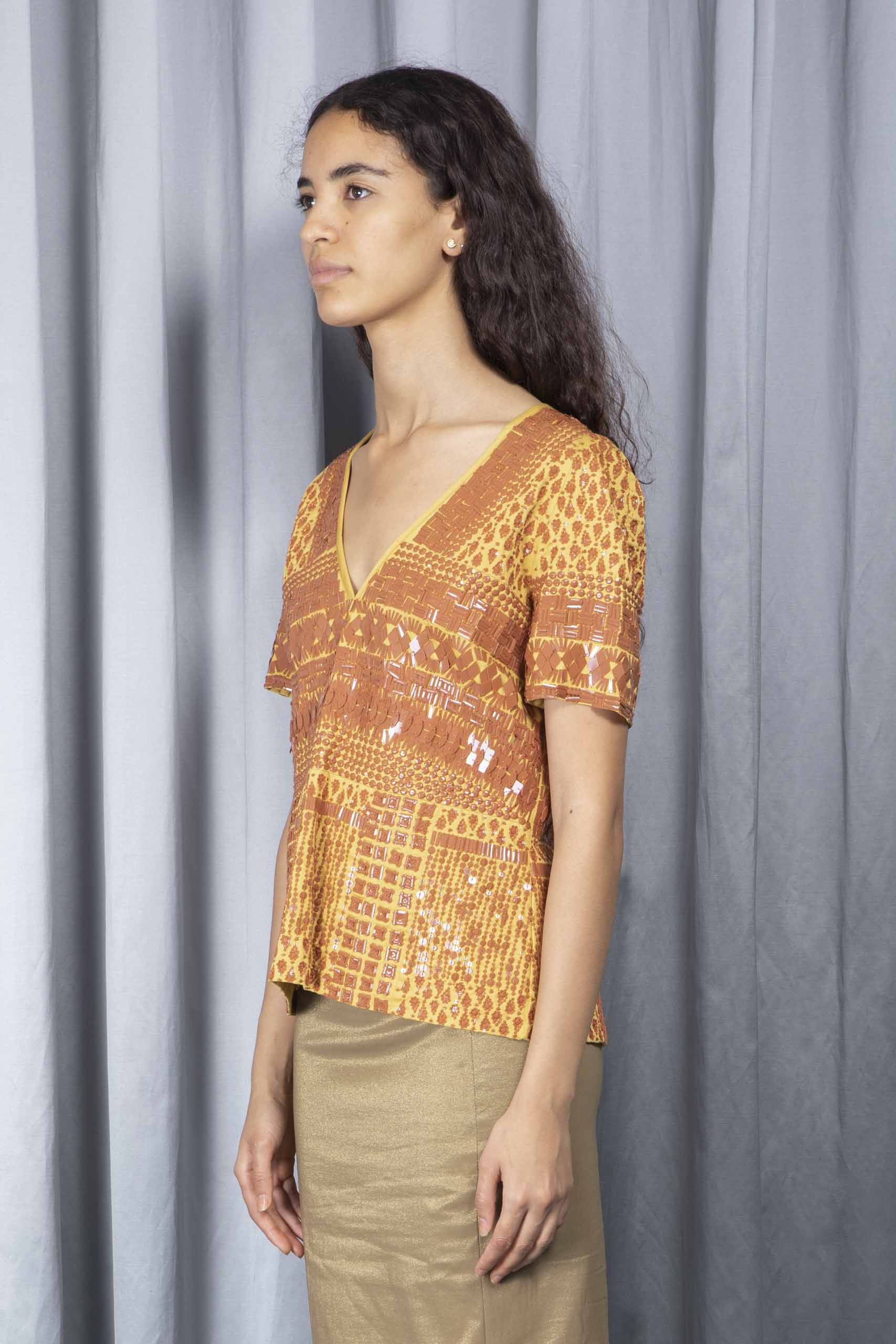 - ochra canvas, all-over embroidery with dark pink sequins of different shapes