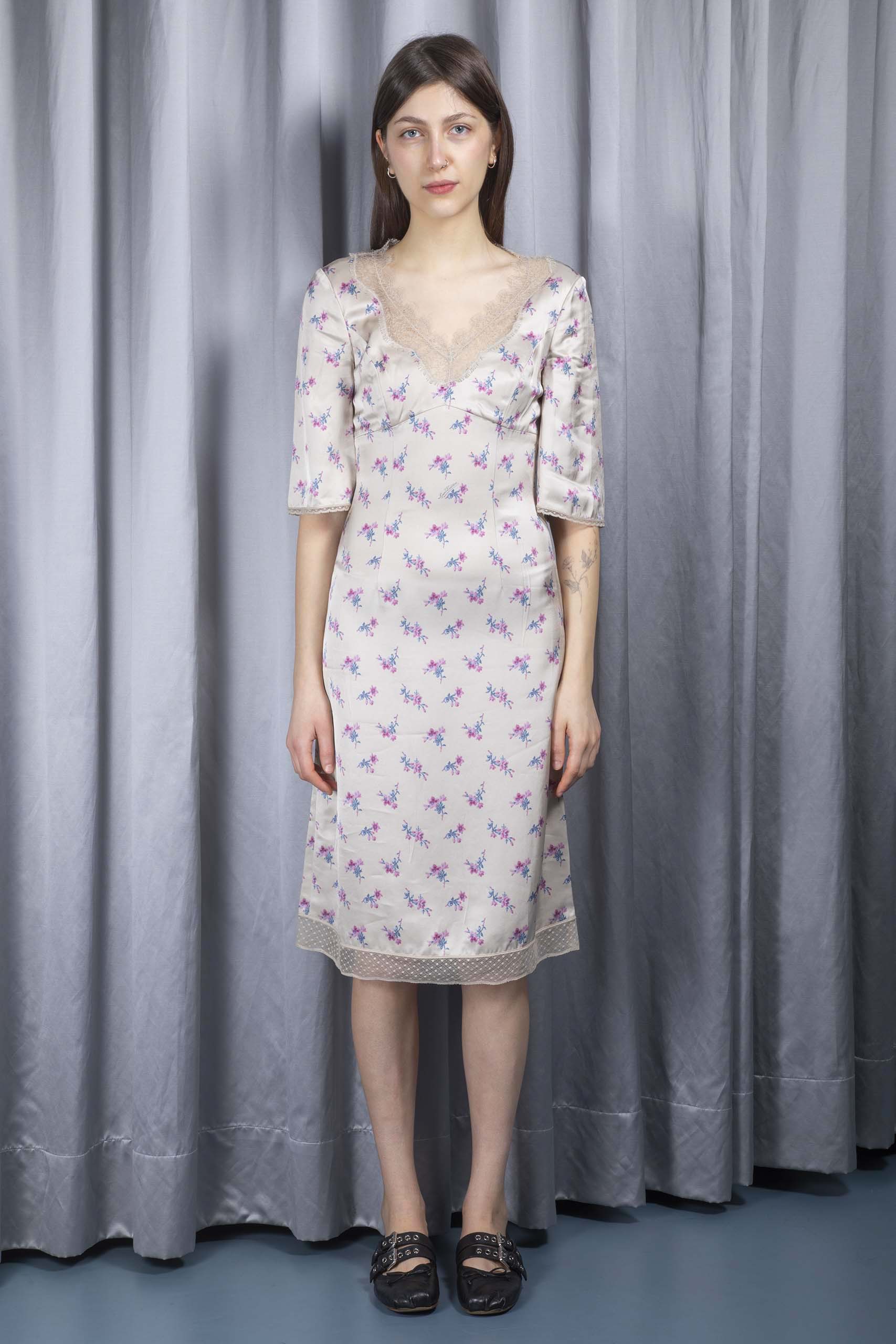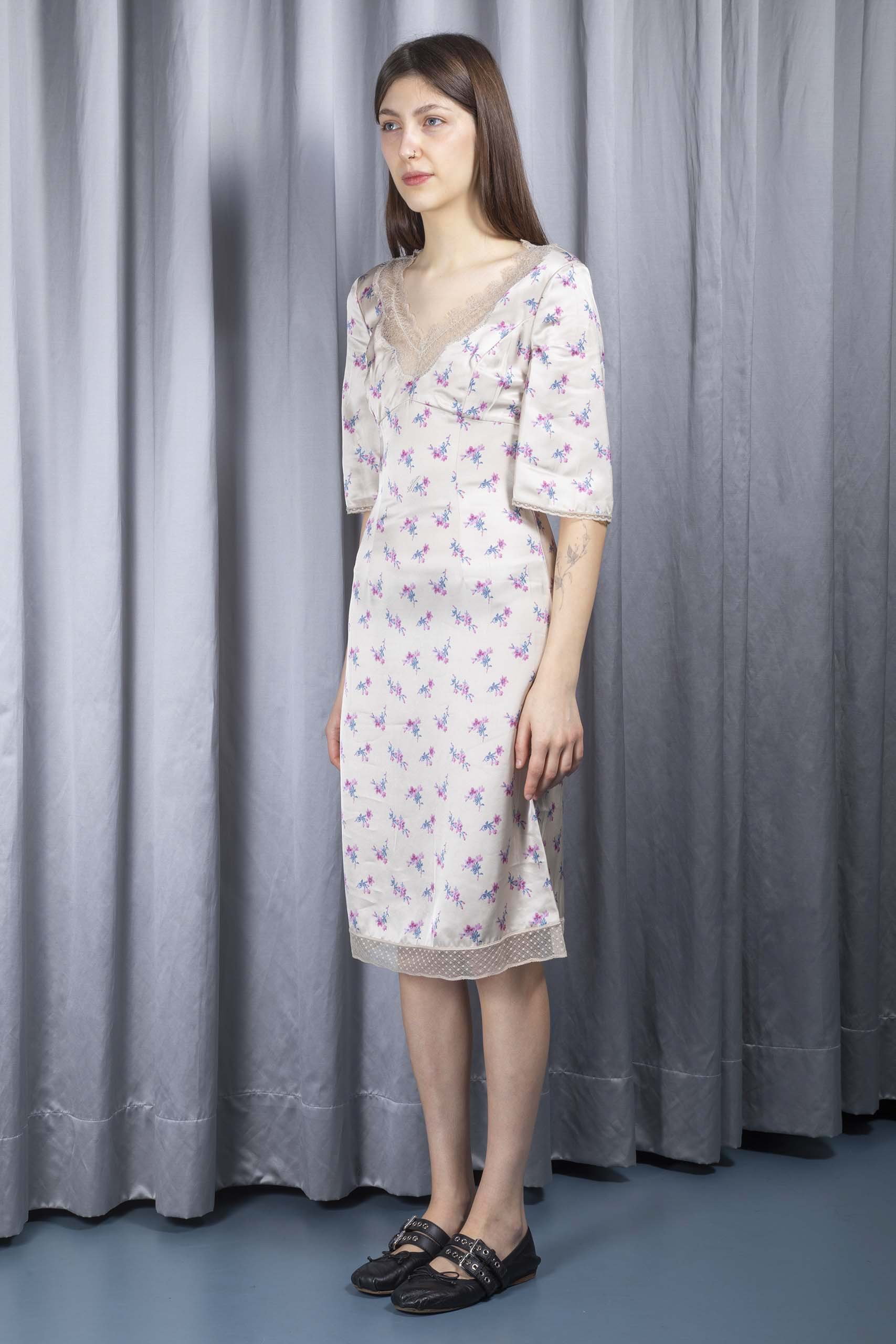 Lace-trimmed floral satin dress