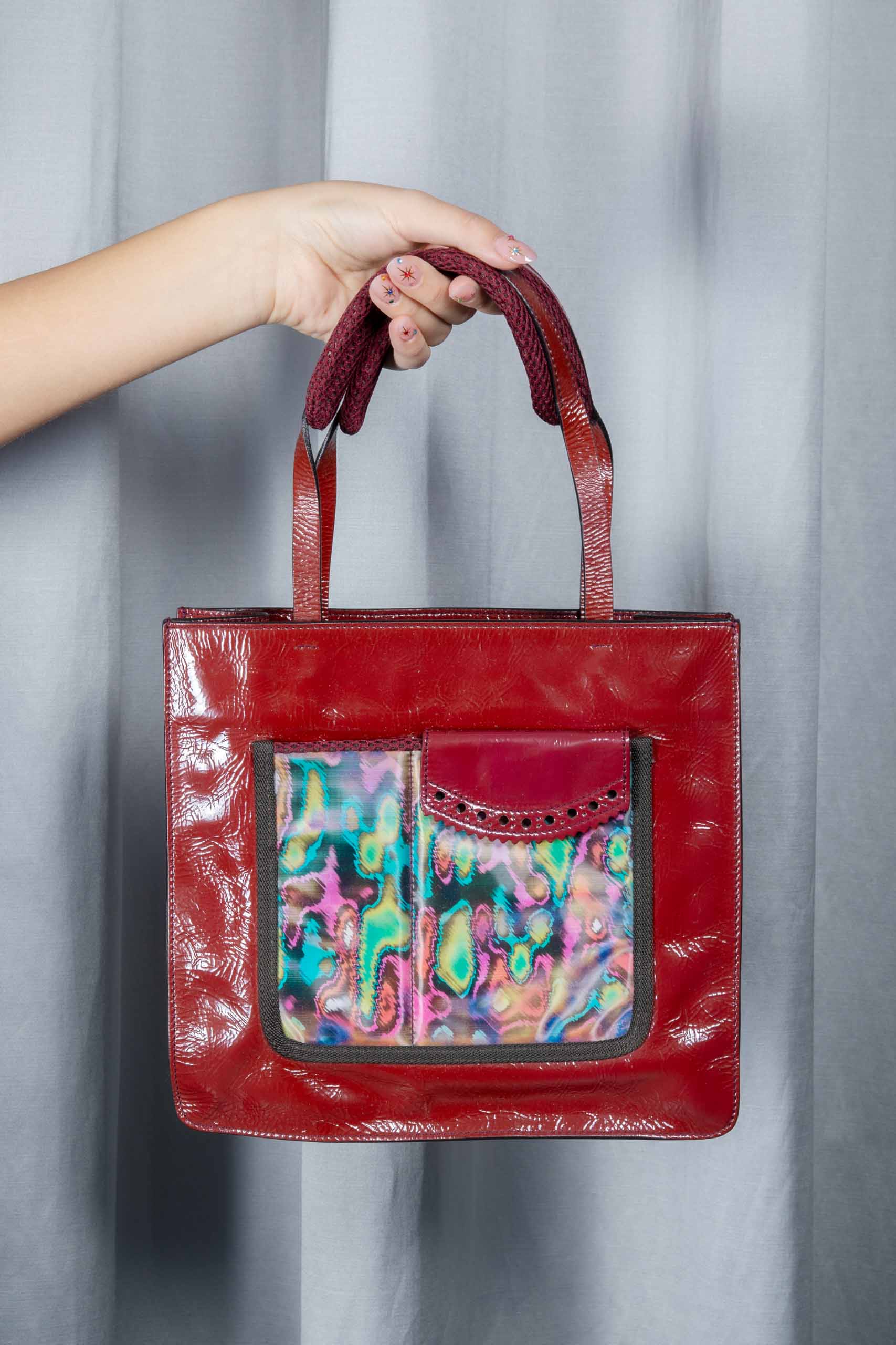 Hologram patent leather handbag