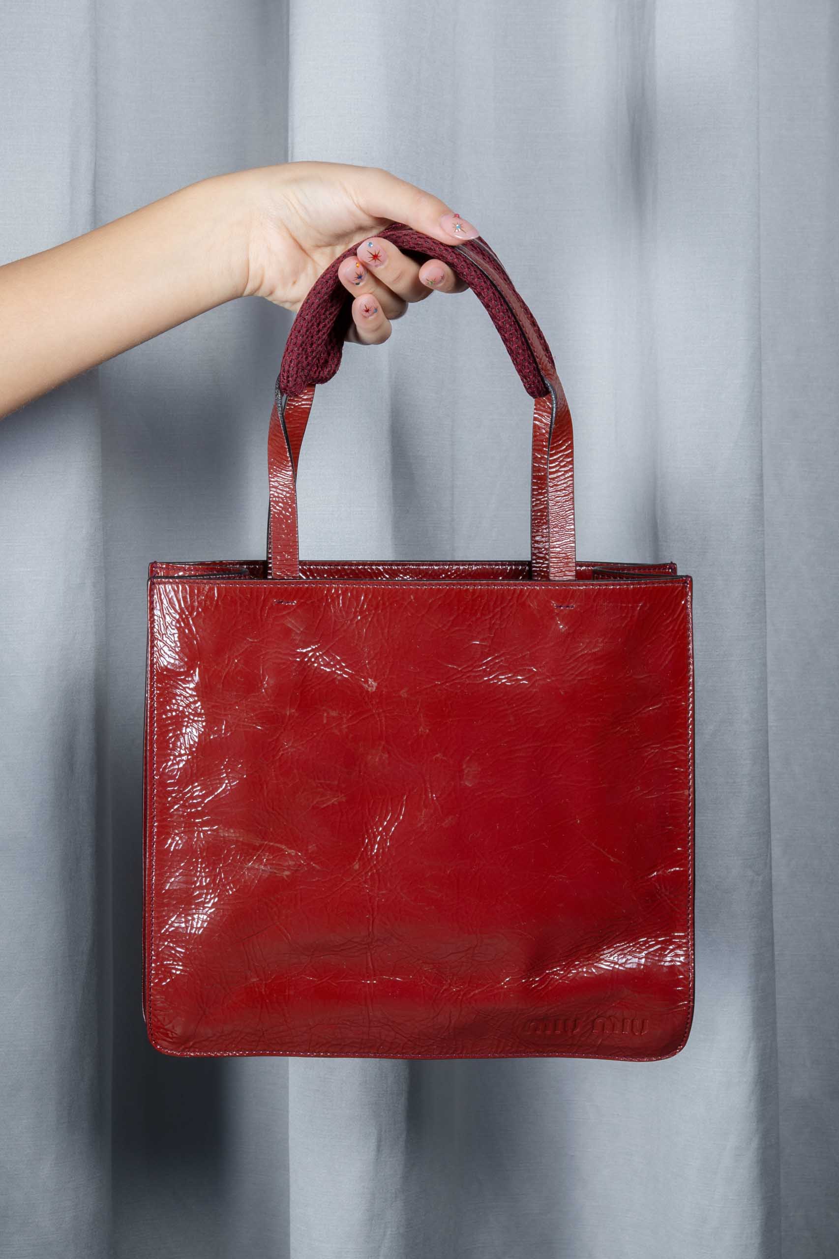 - neoprene mesh and patent leather handles