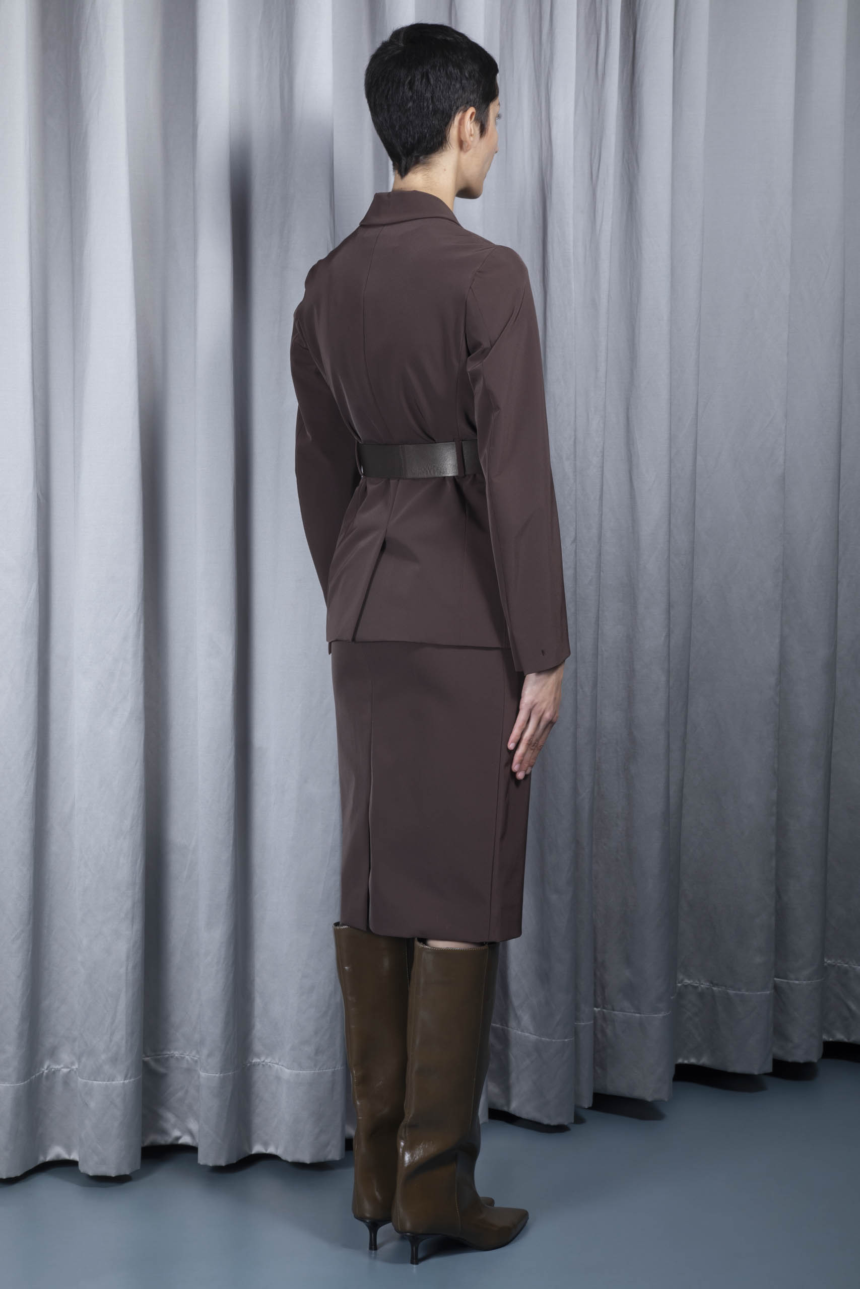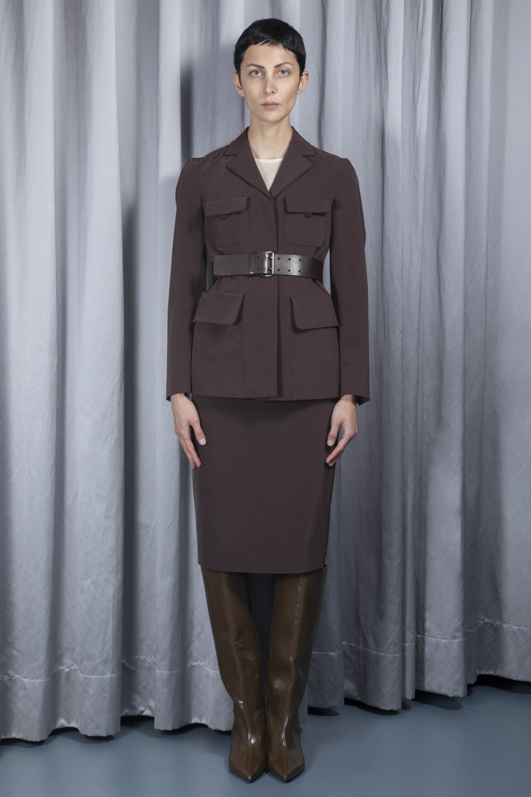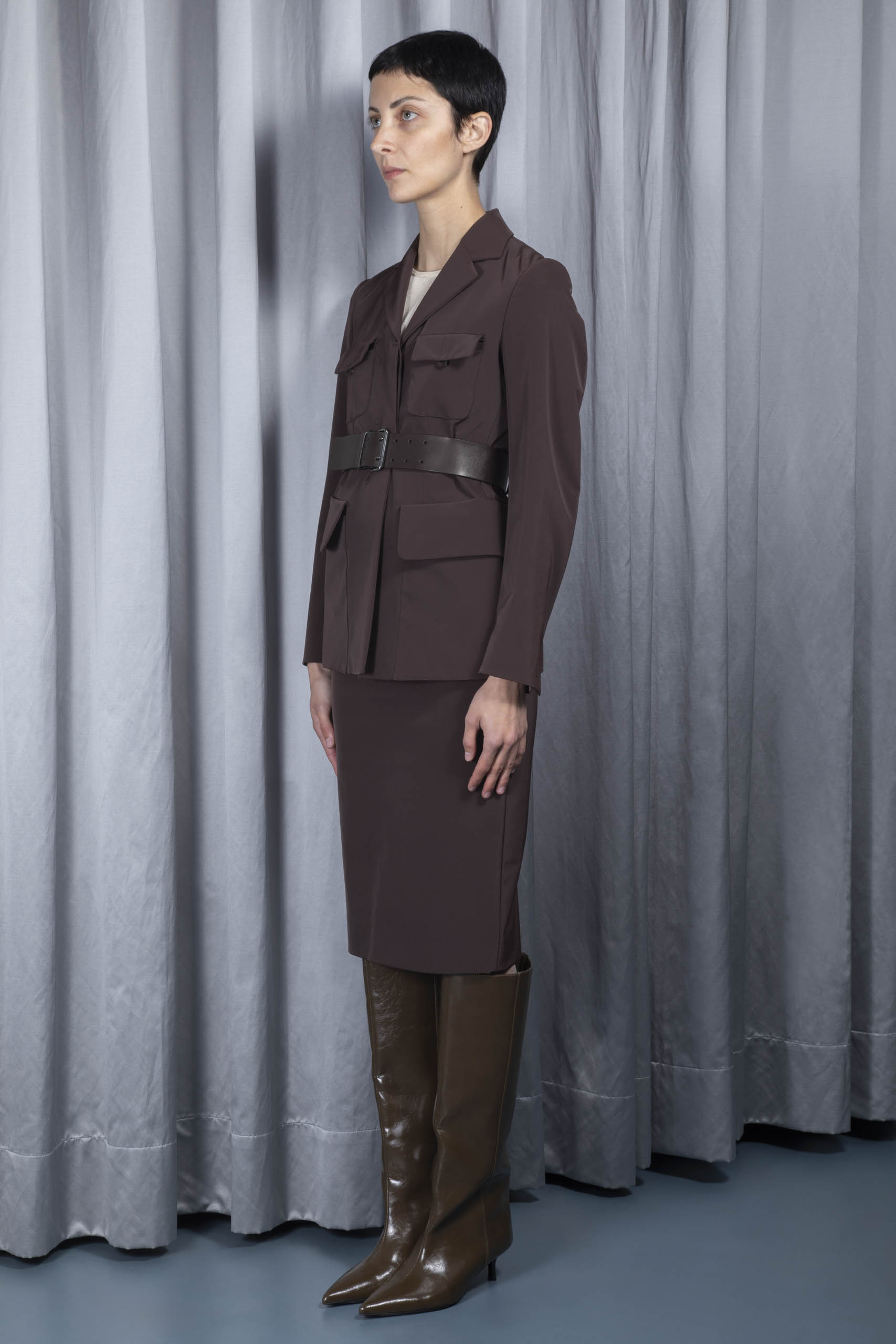 - jacket: concealed button fastening, detachable adjustable brown leather belt, dark silver metal buckle, belt loops, buttoned cuffs, flap pockets, press stud fastening flap chest poclets, back slit