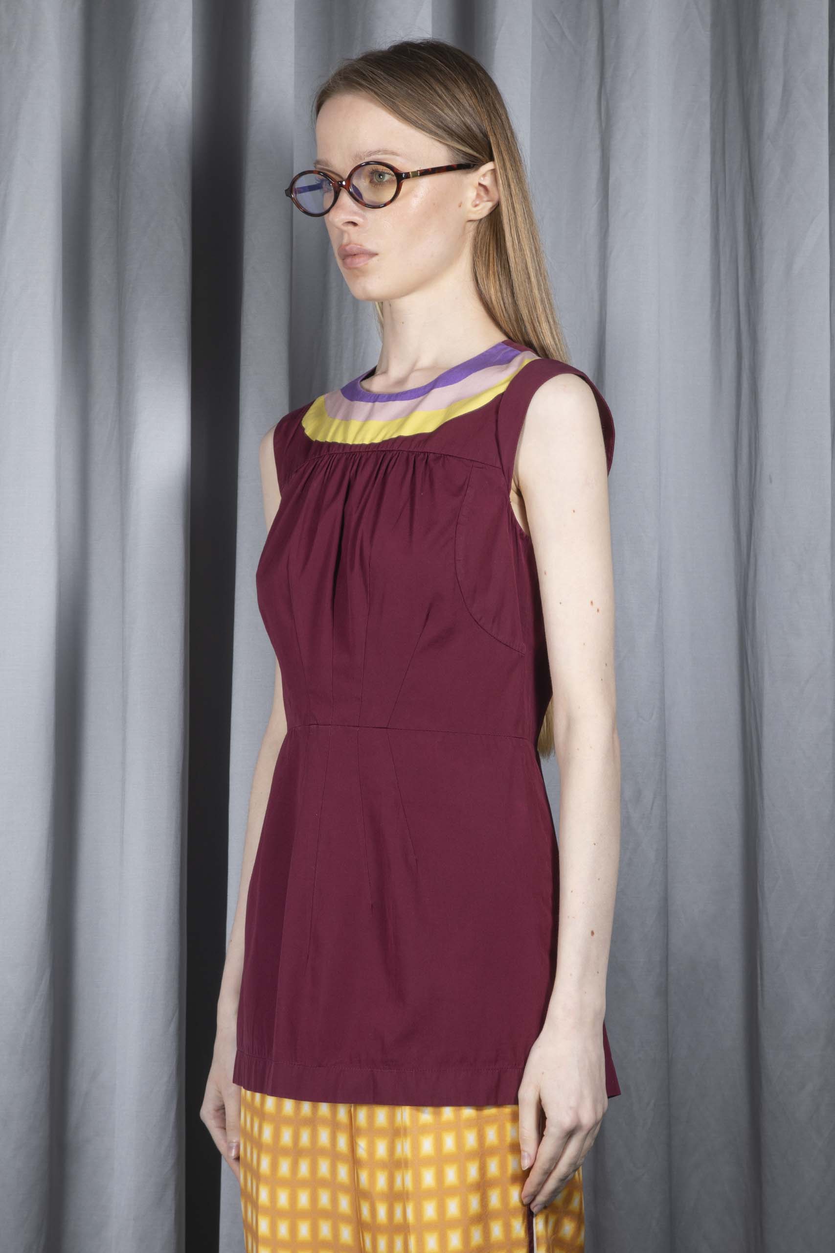• burgundy with purple, pale pink and pale yellow neckline
