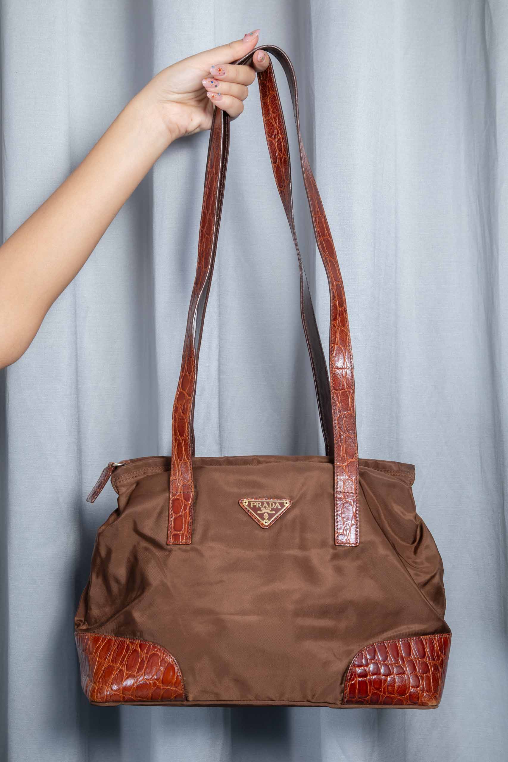 - brown nylon with brown croc-print leather corners