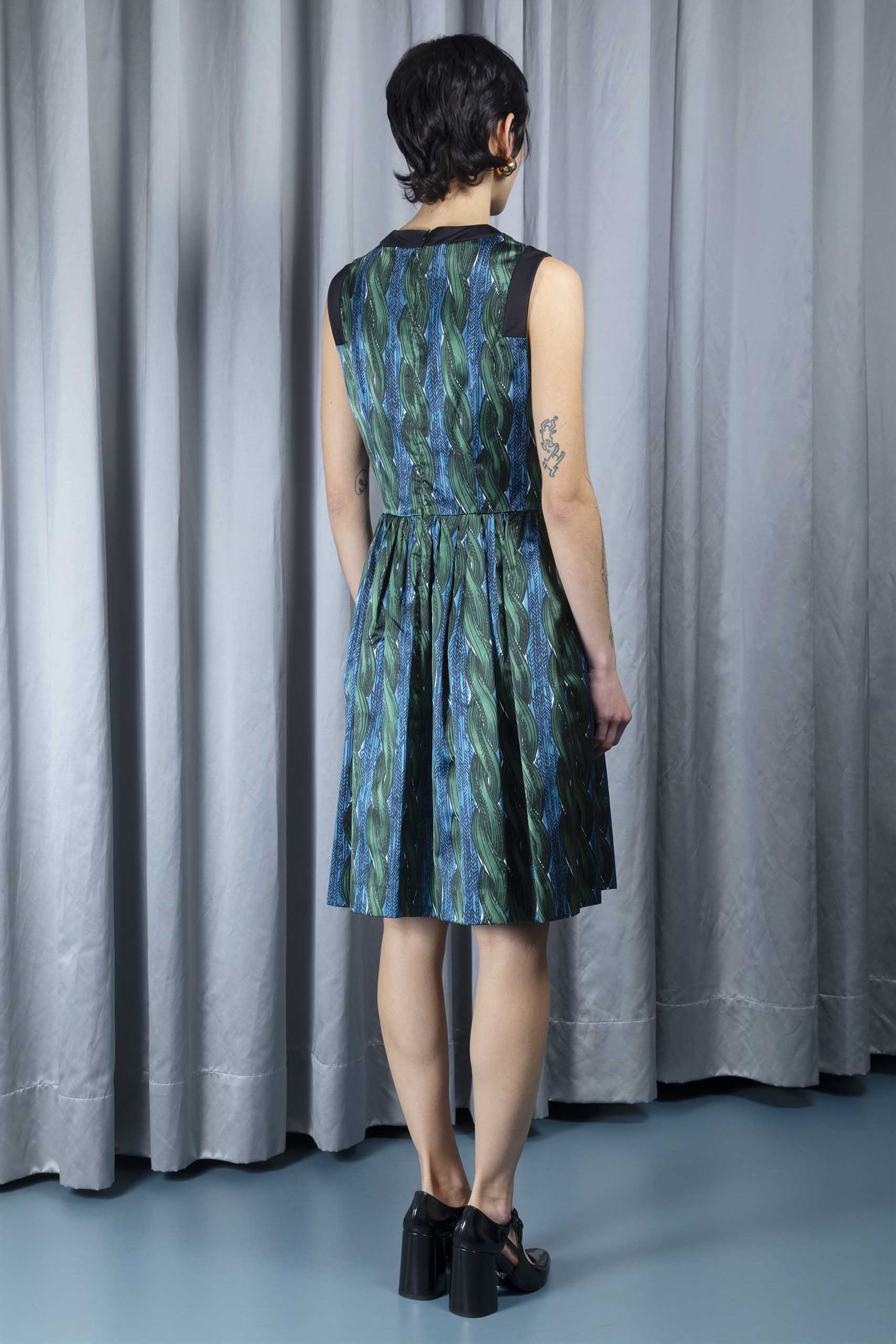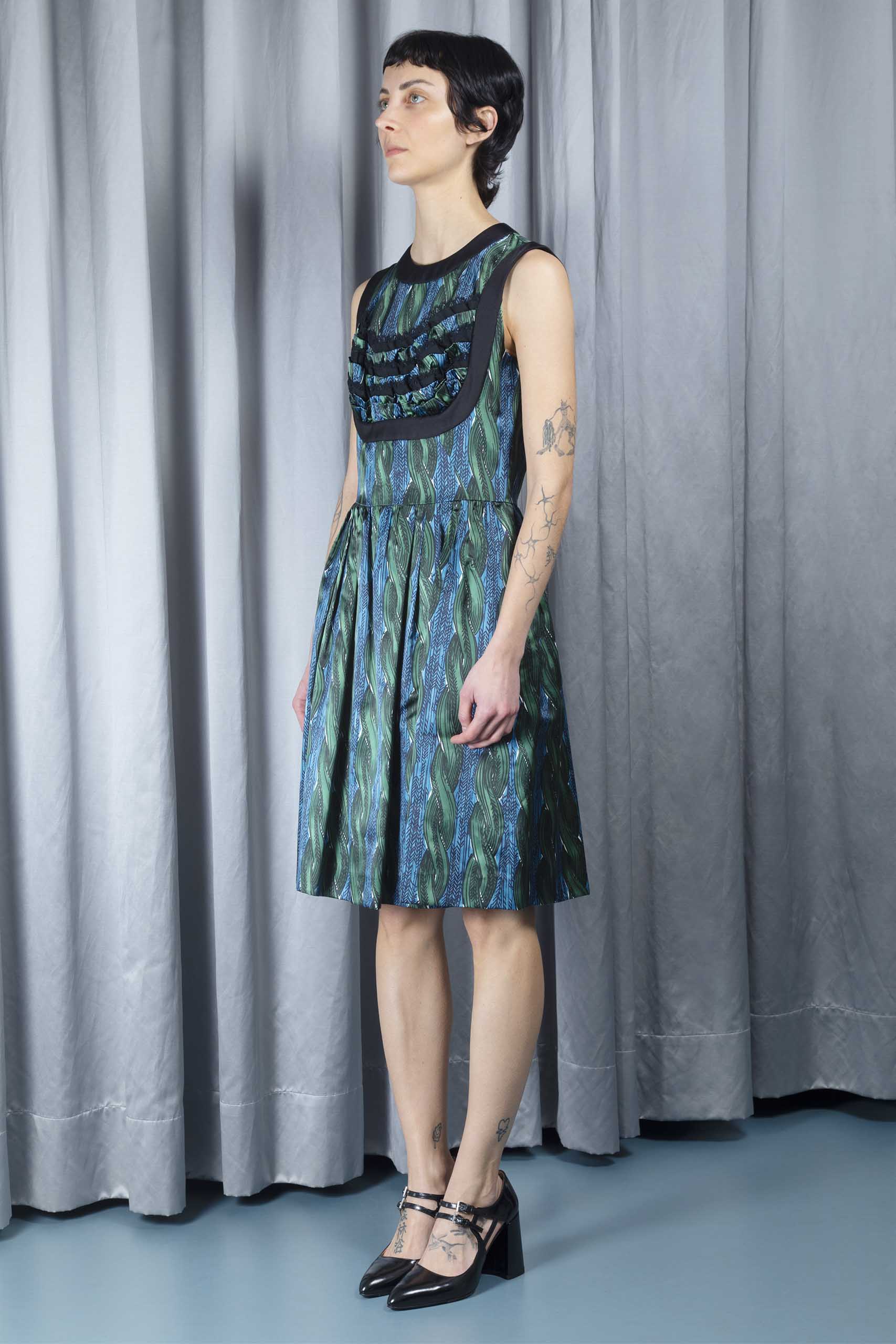 Ruffle-front printed silk dress