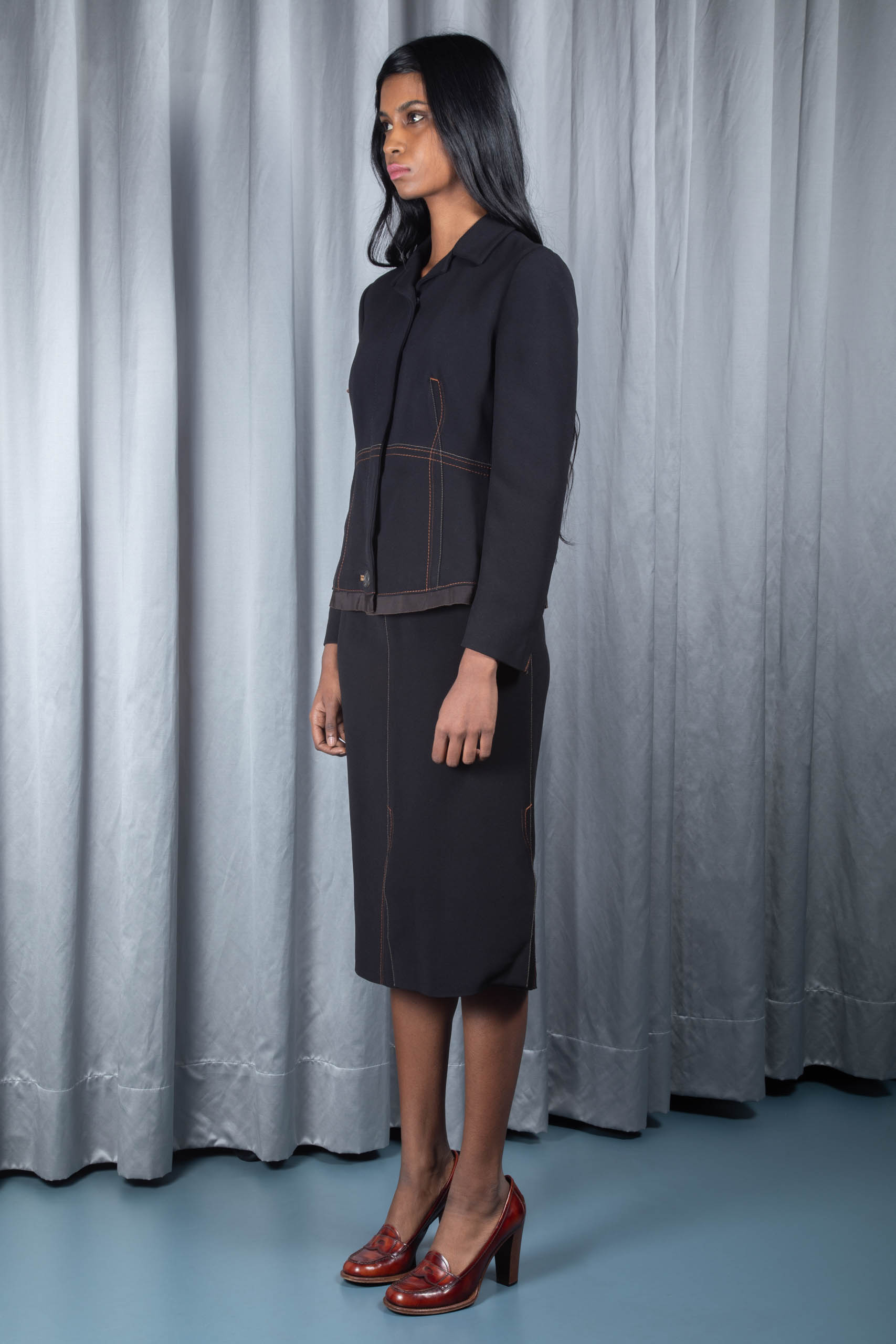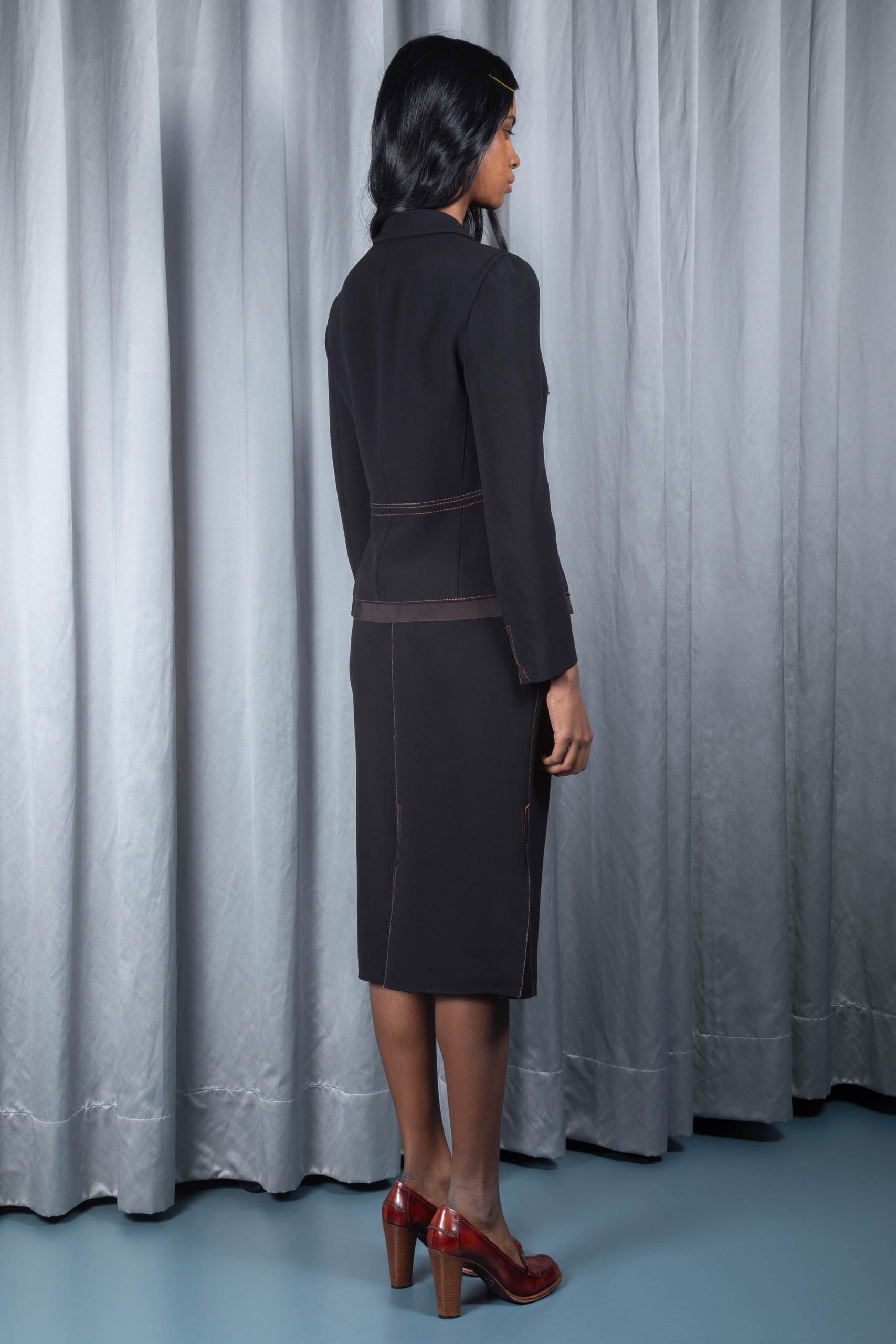 - skirt: zip fastening, brown grosgrain waistband, front, back and side slits, midi length