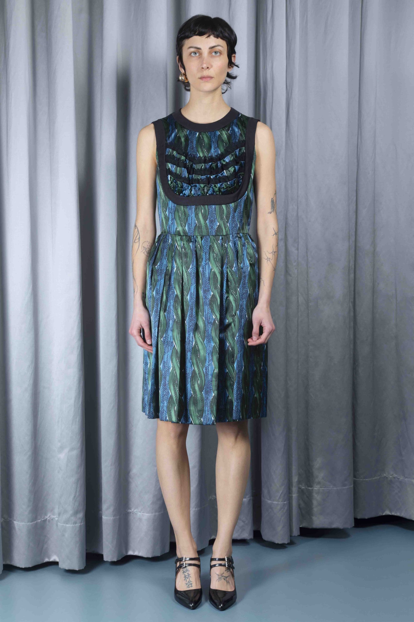 Ruffle-front printed silk dress