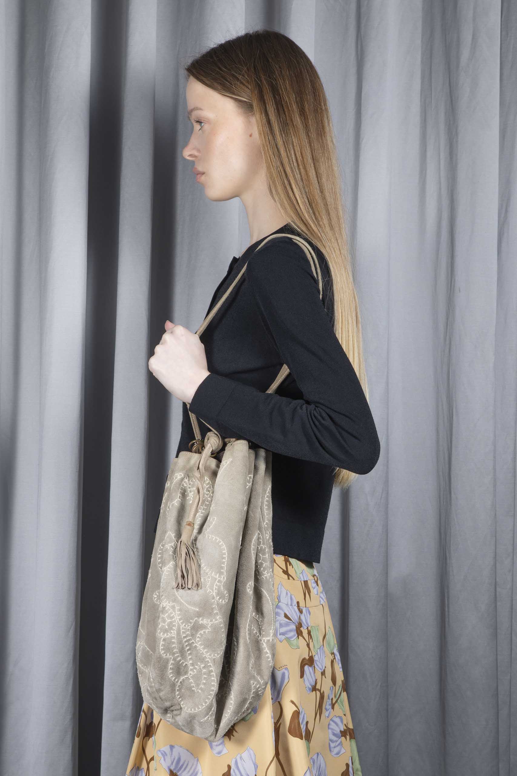 Embroidered suede bucket bag